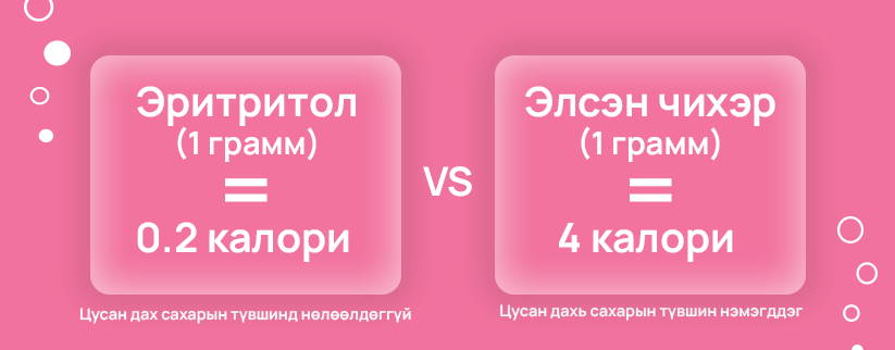 Тухайлбал, OOHA бүтээгдэхүүнд агуулагдах “эритритол” грамм тутамдаа 0.2 ккал агуулдаг нь энгийн сахарын 4 ккал-тай харьцуулахад 20 дахин бага хэмжээ юм. Эритритолын ихэнх хувь нь нарийн гэдсээр шимэгддэг ч хүний биеийн энерги үүсгэх гинжин хэлхээнд оролцдоггүй. Өөрөөр хэлбэл, хоол боловсруулах замаар шингэж, задрахгүйгээр бүхэл хэлбэрээр шээсээр гадагшилдаг тул цусан дах сахарын түвшинд нөлөөлдөггүй.
